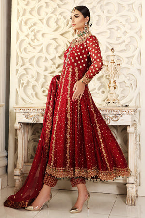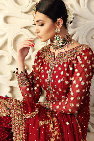A Crimson red cotton net peshwas with antique heavy dapka work. Heavily embellished front and back and sleeves. Pair it up with a beautifully worked trousers and a Chiffon dupatta with gota and sequins spray.