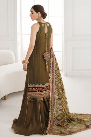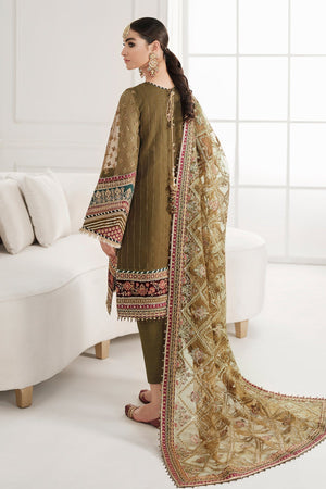 It's time to take your fashion game farthest with a 3-piece olive green chiffon ensemble. The gilded embroidery elaborates the artistic detailing over the shirt. The striking touch of red and maroon intimately complements the outfit's colour. The dupatta accentuates proficiently crafted embroidery. It comes with the silk dyed trouser, draped in elegance. What's your preference? Stitched or unstitched. If it's stitched let us know whether it's a short or long shirt. So, we can tailor it exclusively for you.