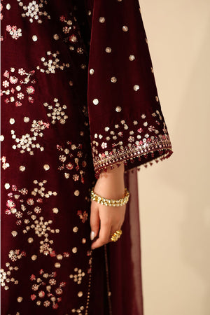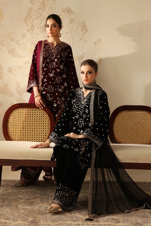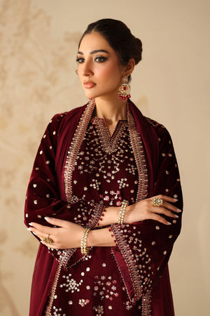 This luxurious outfit features an embroidered velvet front and back with matching velvet sleeves and borders, showcasing exquisite craftsmanship. The silk neckline patch adds a refined touch, while the dyed chiffon dupatta with an embroidered organza border enhances elegance. Completed with embroidered velvet trousers, this ensemble offers both comfort and sophistication, perfect for special occasions.