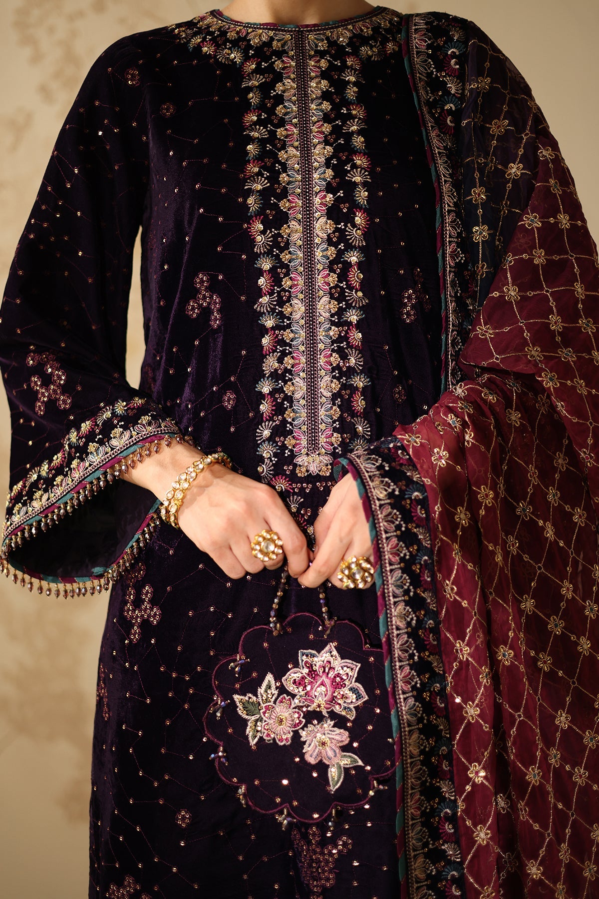 Experience elegance with EMBROIDERED VELVET SF-4319, featuring exquisite embroidered velvet on the front, back, sleeves, and borders. The handmade organza neckline patch adds delicate artistry, while the digital printed chiffon dupatta complements the velvet embroidery beautifully. Paired with dyed silk trousers, this ensemble offers comfort and a luxurious feel, perfect for making a graceful statement.