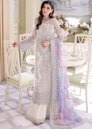 The white long shirt exudes timeless elegance with its clean embroidery and exquisite embellishment. Delicate floral motifs, intricate patterns, shimmering embellishments and double tone sleeves border adorn the dress, creating a mesmerizing tapestry of beauty. Complementing the shirt with the flare pants, which add a modern twist to the traditional attire. Adorned with a border along the bottom hem, the pants elevate the ensemble with their subtle detailing and graceful flare. The combination of the