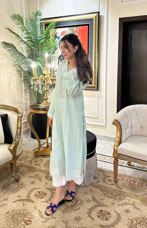 Introducing the Naarj Luxury Lawn Embroidered 3 Piece Unstitched White Lily - Sage Green Schiffli Kurta. Made with high-quality lawn fabric and adorned with delicate embroidery, this kurta offers a touch of elegance to your wardrobe. Experience comfort and style with this beautiful ensemble.
