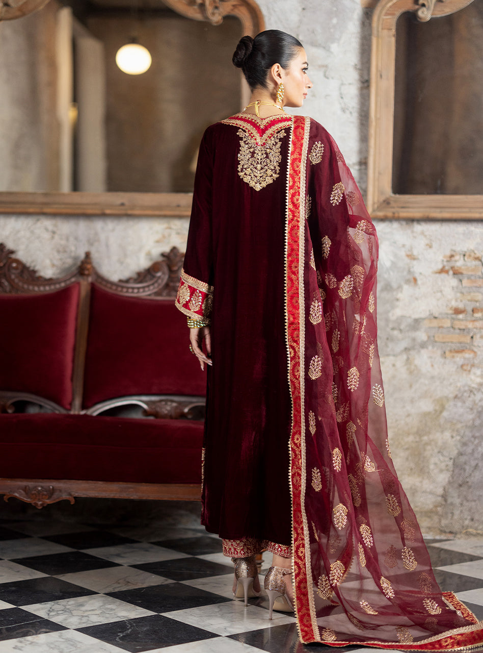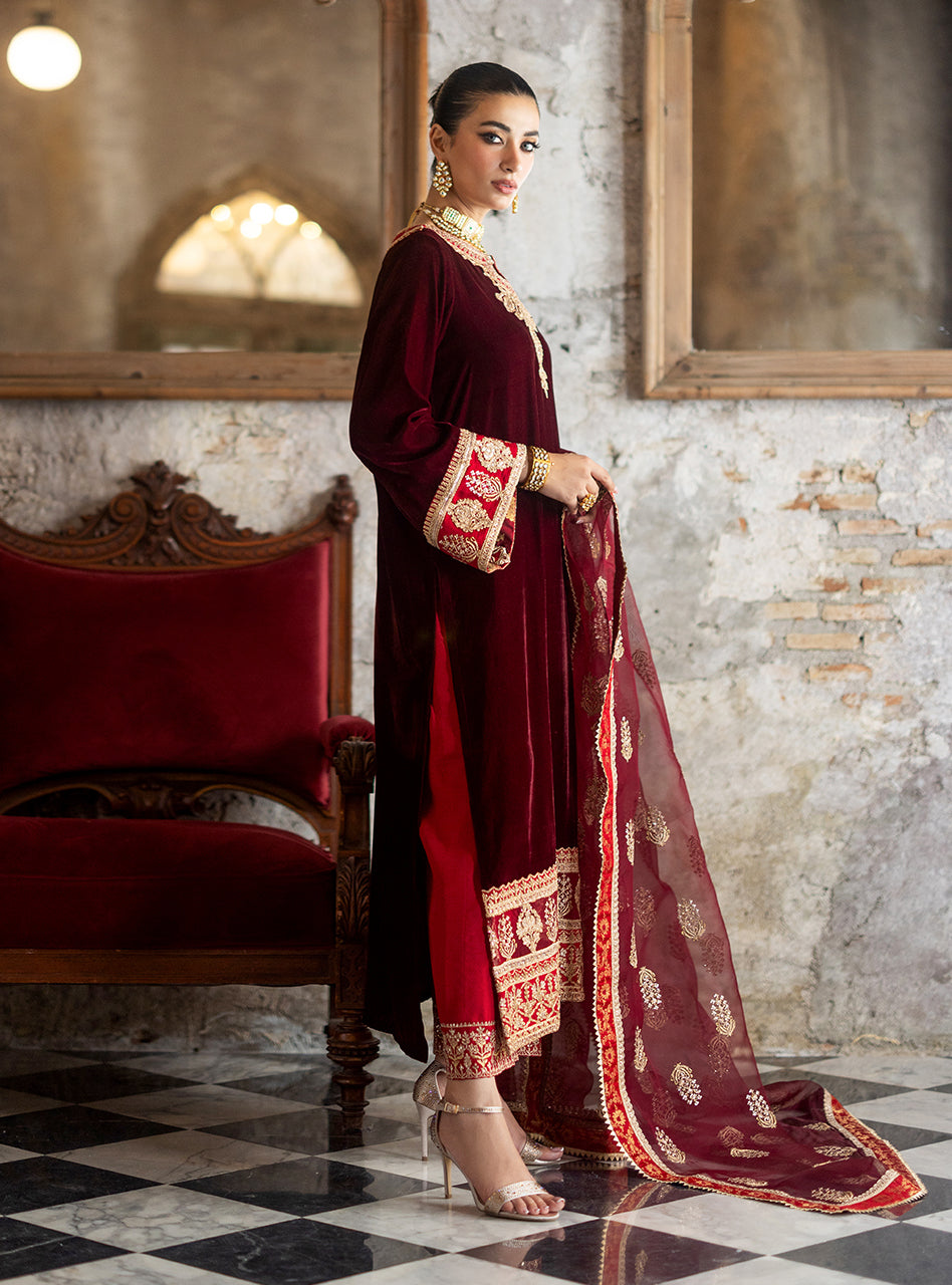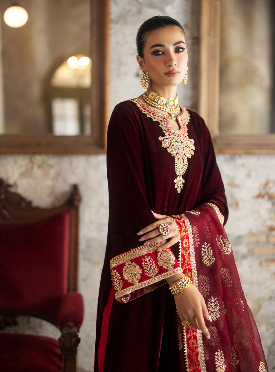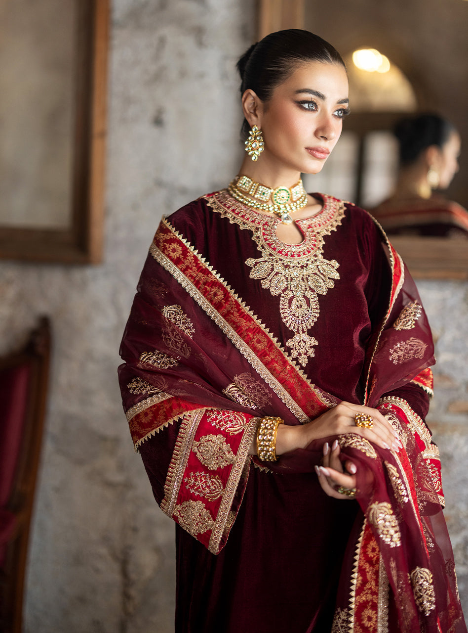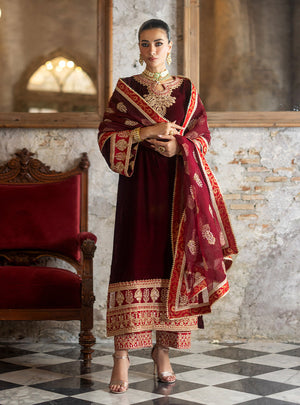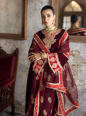 This bold maroon ensemble, crafted from sumptuous velvet, radiates regal elegance. The neckline features exquisite golden embroidery with subtle hints of red, adding depth and richness to the design, sleeves and hem are delicately embellished with matching golden threadwork along the red spray, Completing the look with a maroon organza dupatta, scattered with shimmering golden motifs, with elegant red and golden borders, adding a touch of finesse. This striking ensemble is perfect for those seeking a bold, statement look, ideal for weddings, festive celebrations, or formal gatherings.